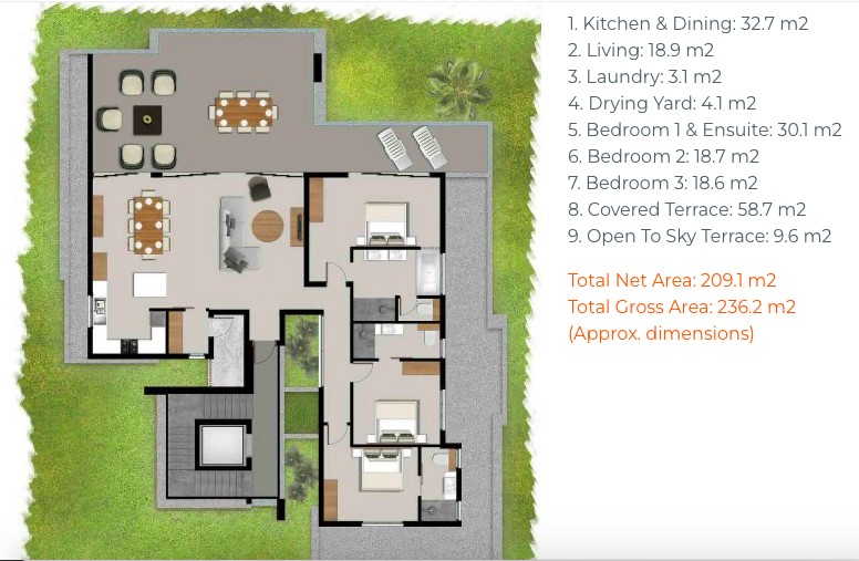 This new project is a complex of 15 properties in three blocks, consisting of 12 apartments and 3 penthouses on a land of 6730m2. With a breath-taking view over a huge garden, you are sure to make the most of nature while enjoying the modern setting of your new apartment/penthouse. The property also comes with additional features such as a gate entrance (1) a technical and security post (2) 2 private parkings per apartment (3) a bio garden (4) a rim-flow pool (5) a petanque course (6) and a BBQ area (7) for the most complete experience. * A non-citizen who has acquired an apartment in a G+2 (building of at least 2 floors above ground floor) for a consideration exceeding the amount of $375 000, would be eligible to submit an application for a long stay visa.